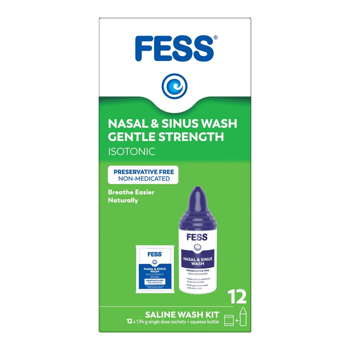 FESS Nasal & Sinus Wash is an easy squeeze bottle system that allows you to deliver the saline solution with positive pressure to clean the nasal passages thoroughly.